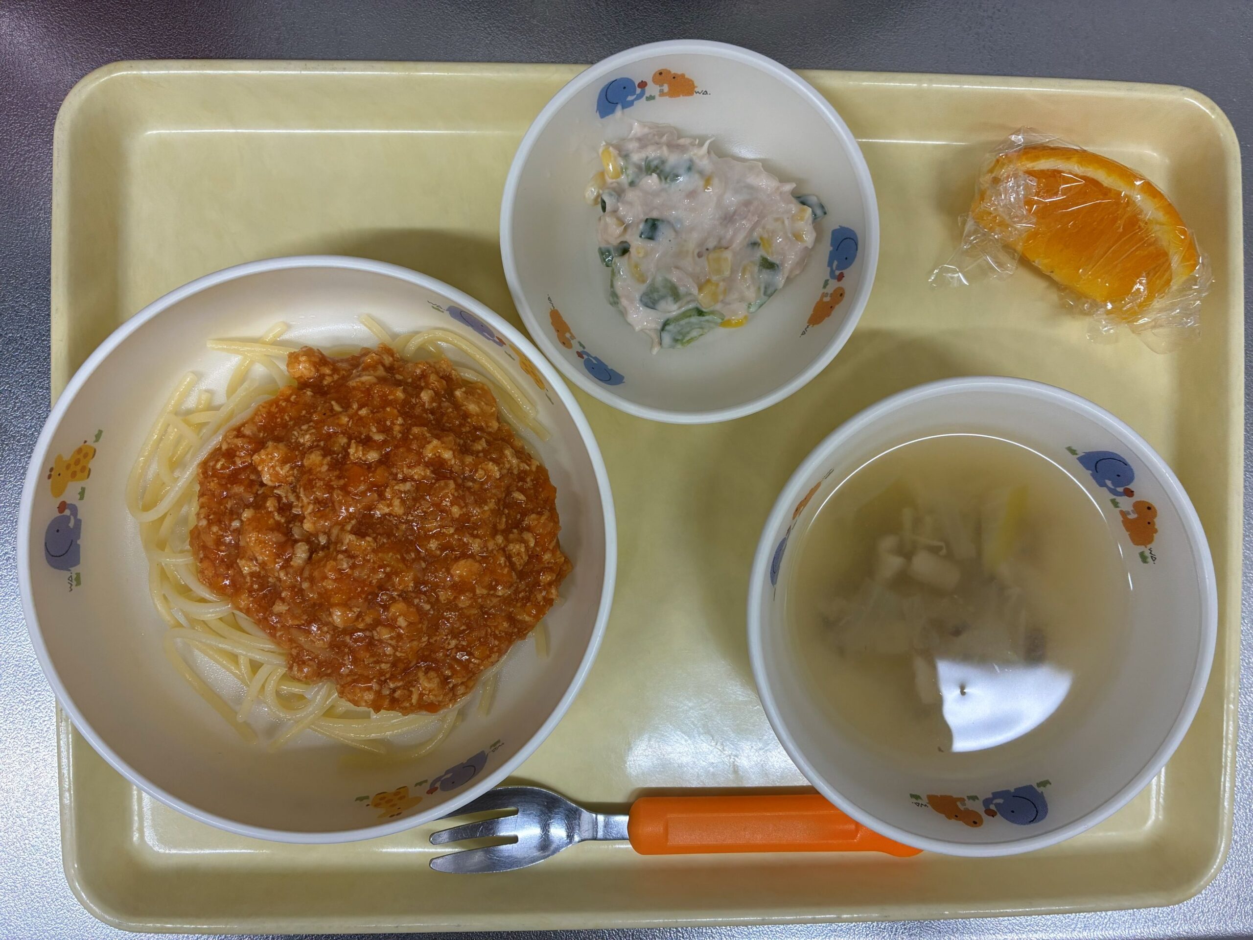 ミートスパゲティ ツナとコーンのサラダ コンソメスープ オレンジ