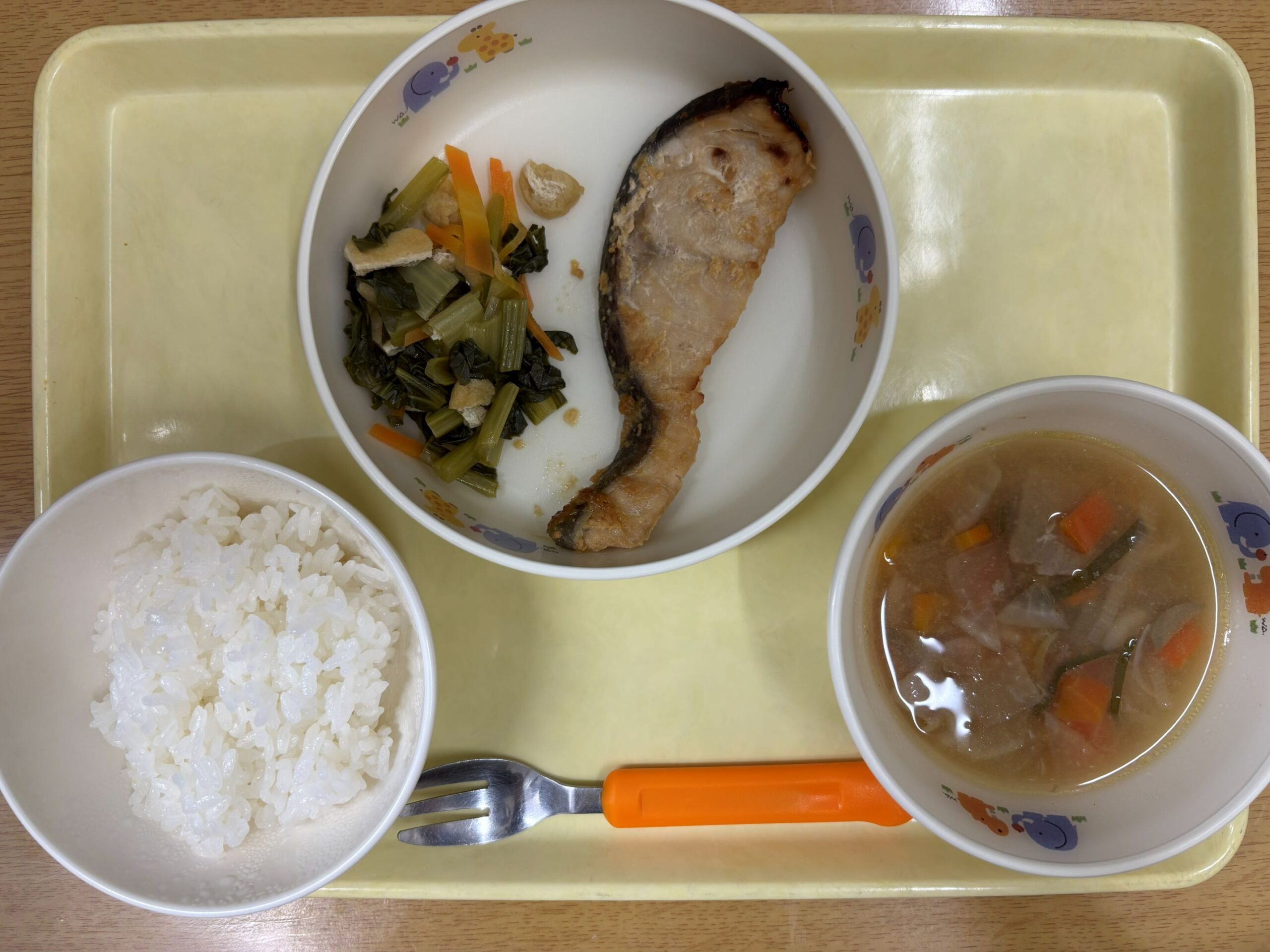 ご飯 さけの西京焼き 小松菜の煮浸し 豚汁