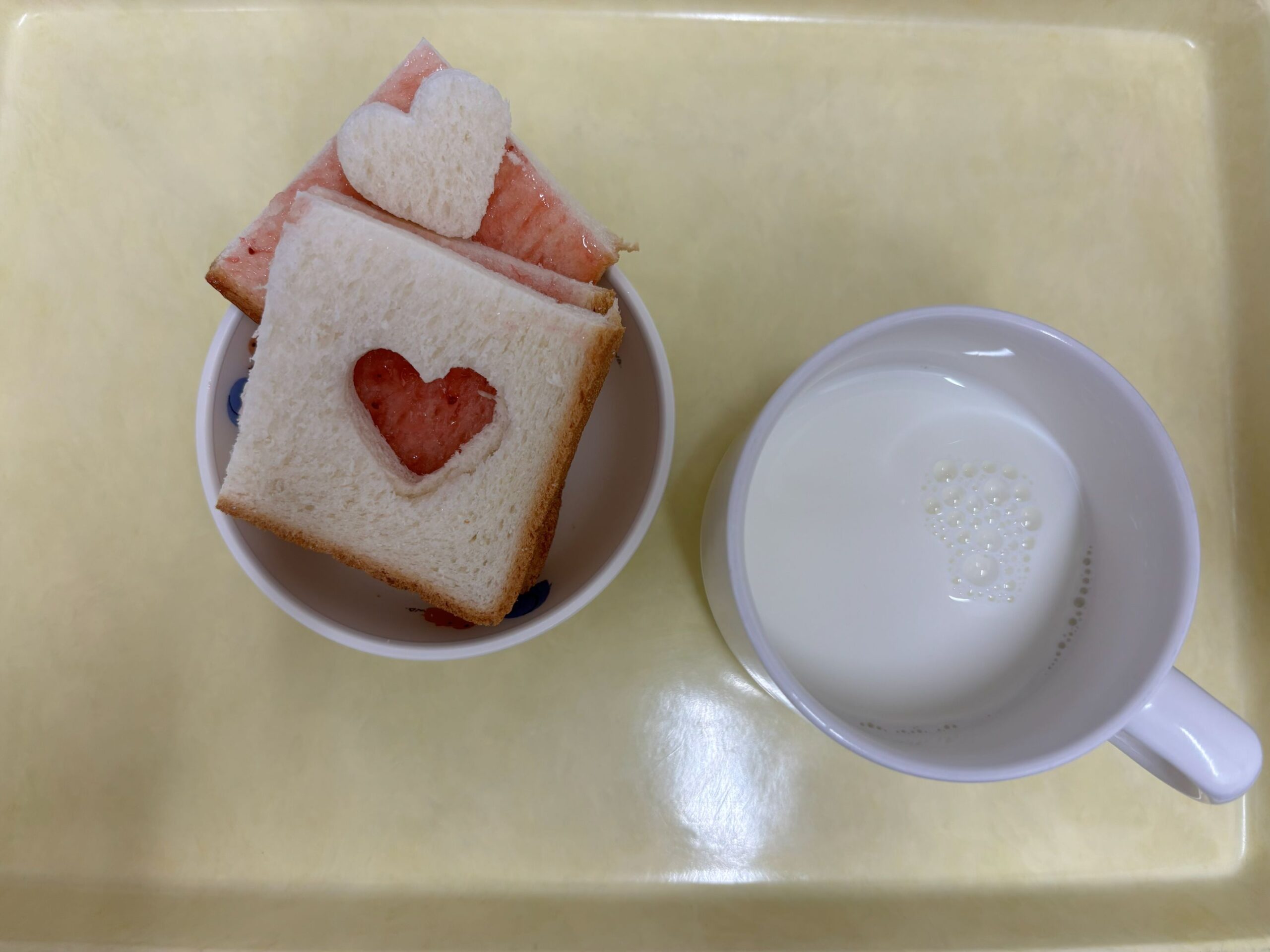 今日は、どれもよく食べてました。特に豚汁が具沢山で子ども達に人気でした。 おやつのいちごジャムパンは、星やハートの形にくり抜いたので子ども達も喜んで食べていました。