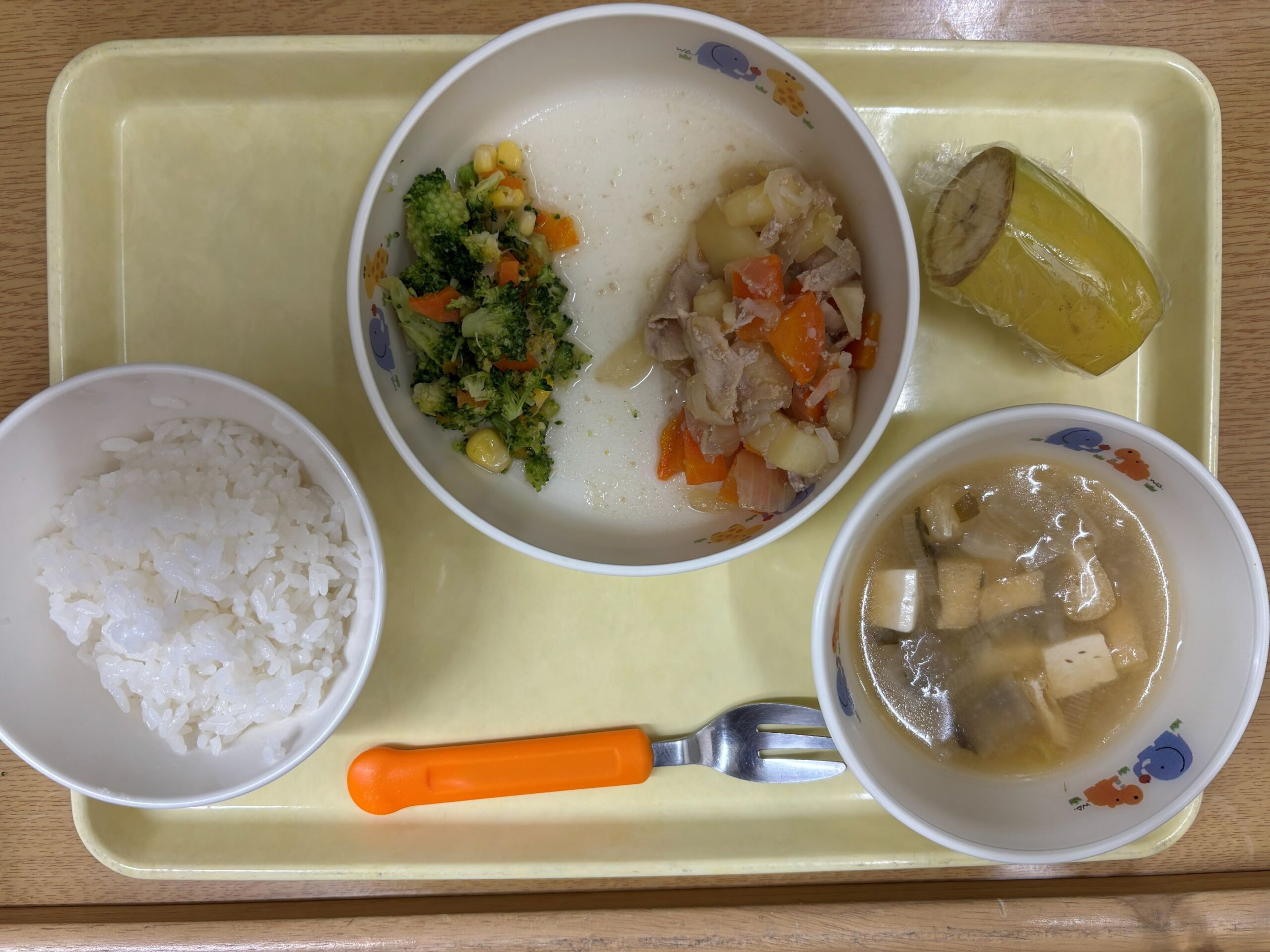 ご飯 肉じゃが ブロッコリーサラダ みそ汁 バナナ