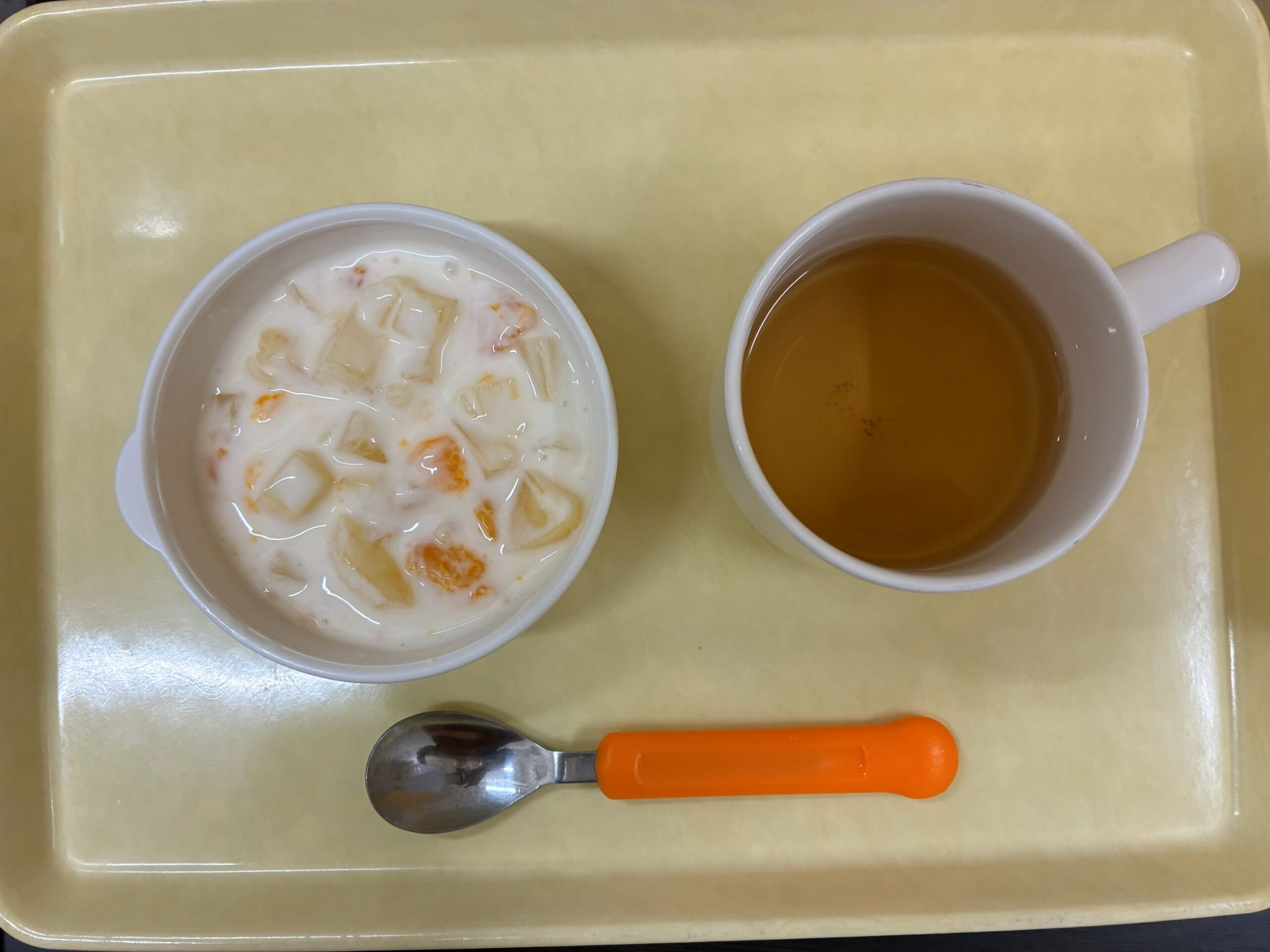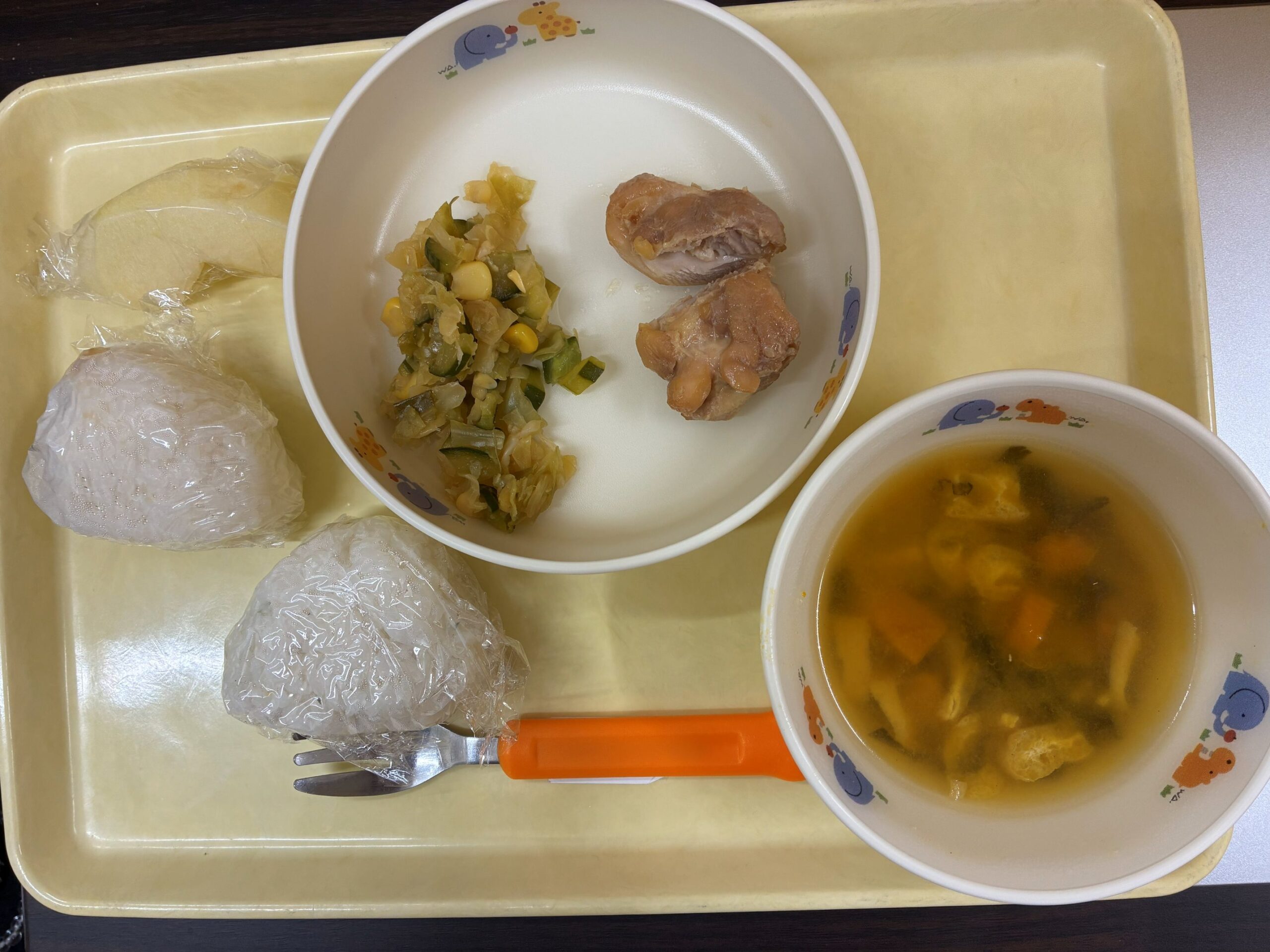 七草おにぎり、野菜嫌いの子供も食べていました。 鶏の照り焼きは、美味しいと言って食べていました。 フルーツヨーグルトは、食べていました。