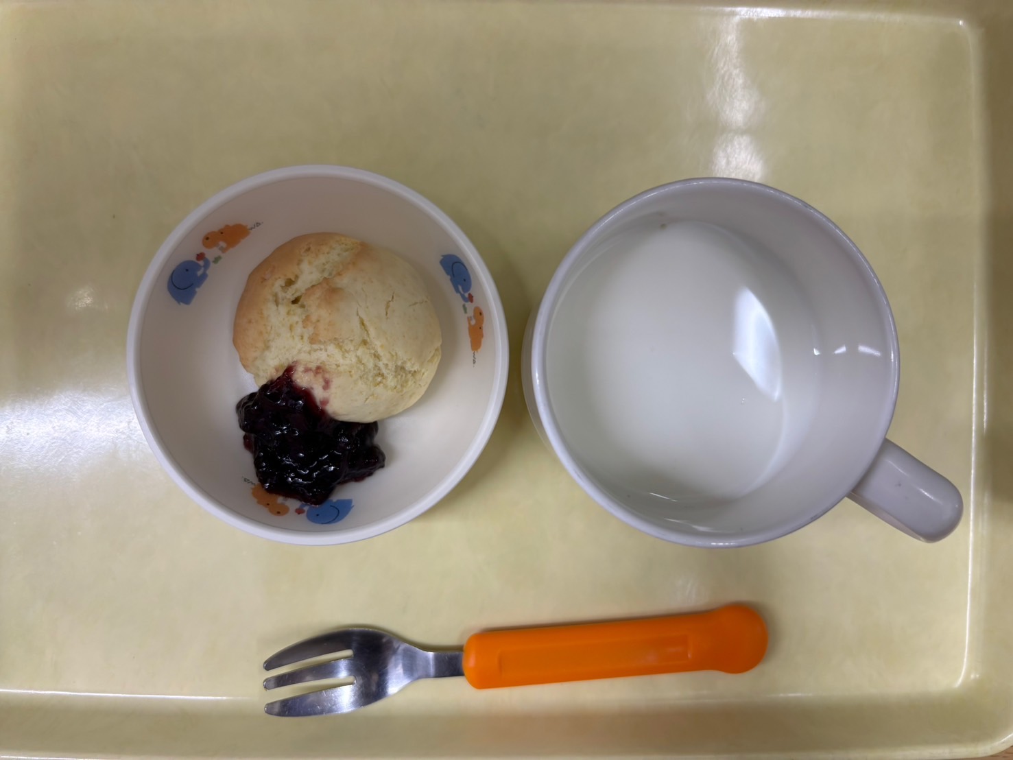 子ども達は、鶏肉とチンゲン菜の炒めものをご飯に混ぜて沢山おかわりしてました。 さつまいもサラダもさつまいもの甘みがあり人気でした。 おやつのスコーンは、ジャムを付けて食べる子もいたりそのまま食べる子もいて完食する子が多かったです。