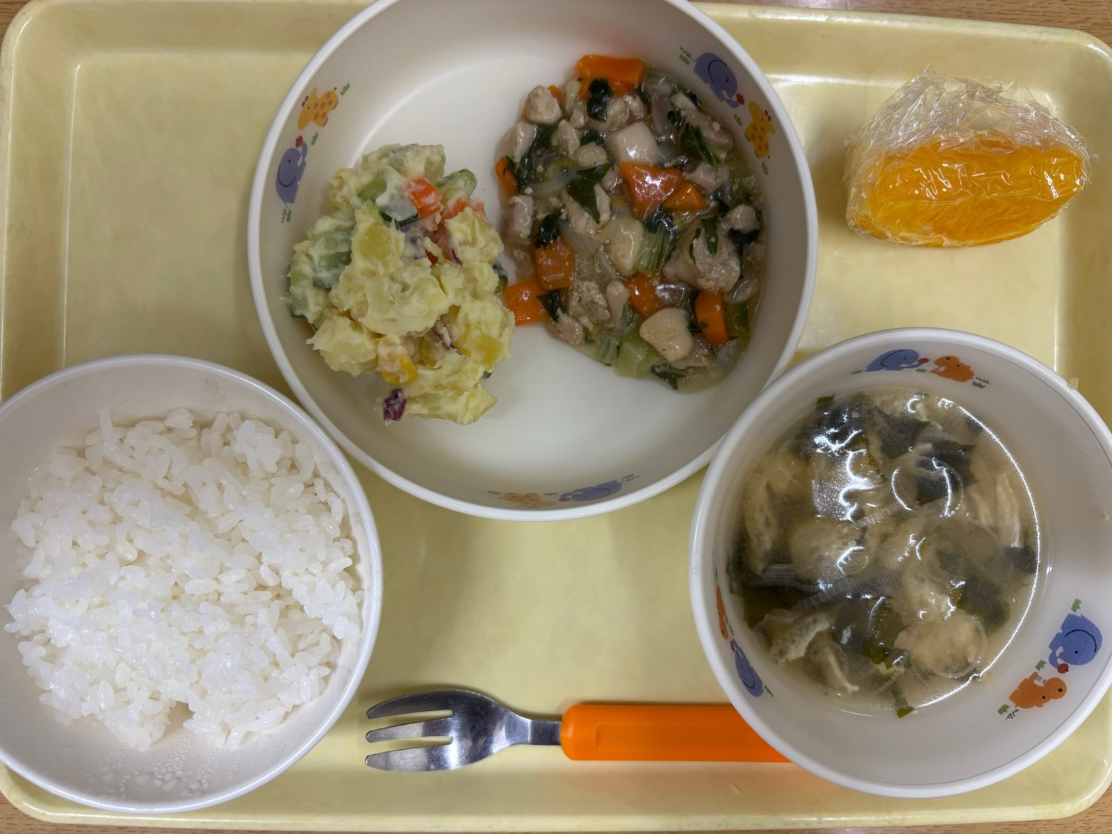 ご飯 鶏肉とチンゲン菜の中華炒め さつまいもマヨサラダ みそ汁(あげ) オレンジ