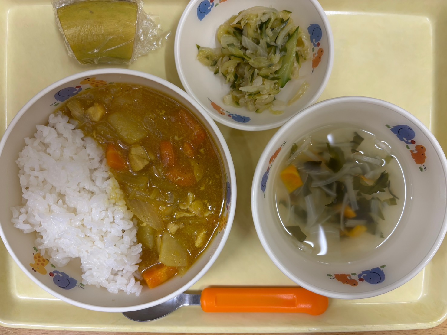 カレーライス キャベツと胡瓜とコーンの和えサラダ わかめスープ バナナ