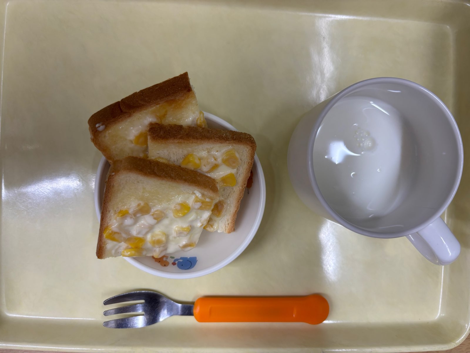 カレーライスは、子ども達が大好きなメニューで沢山おかわりしてました。 おやつのコーンマヨトーストも牛乳と一緒によく食べていました。