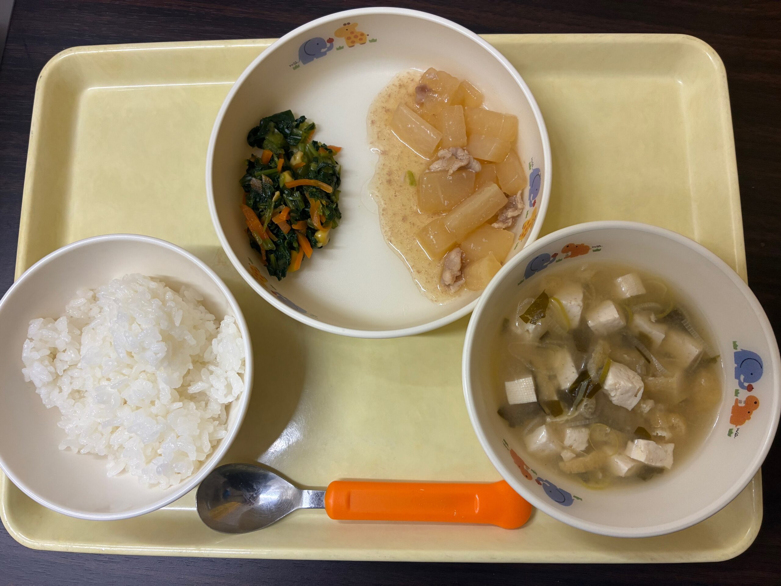 ご飯 大根と豚肉の煮物 小松菜とコーンの和え物 みそ汁