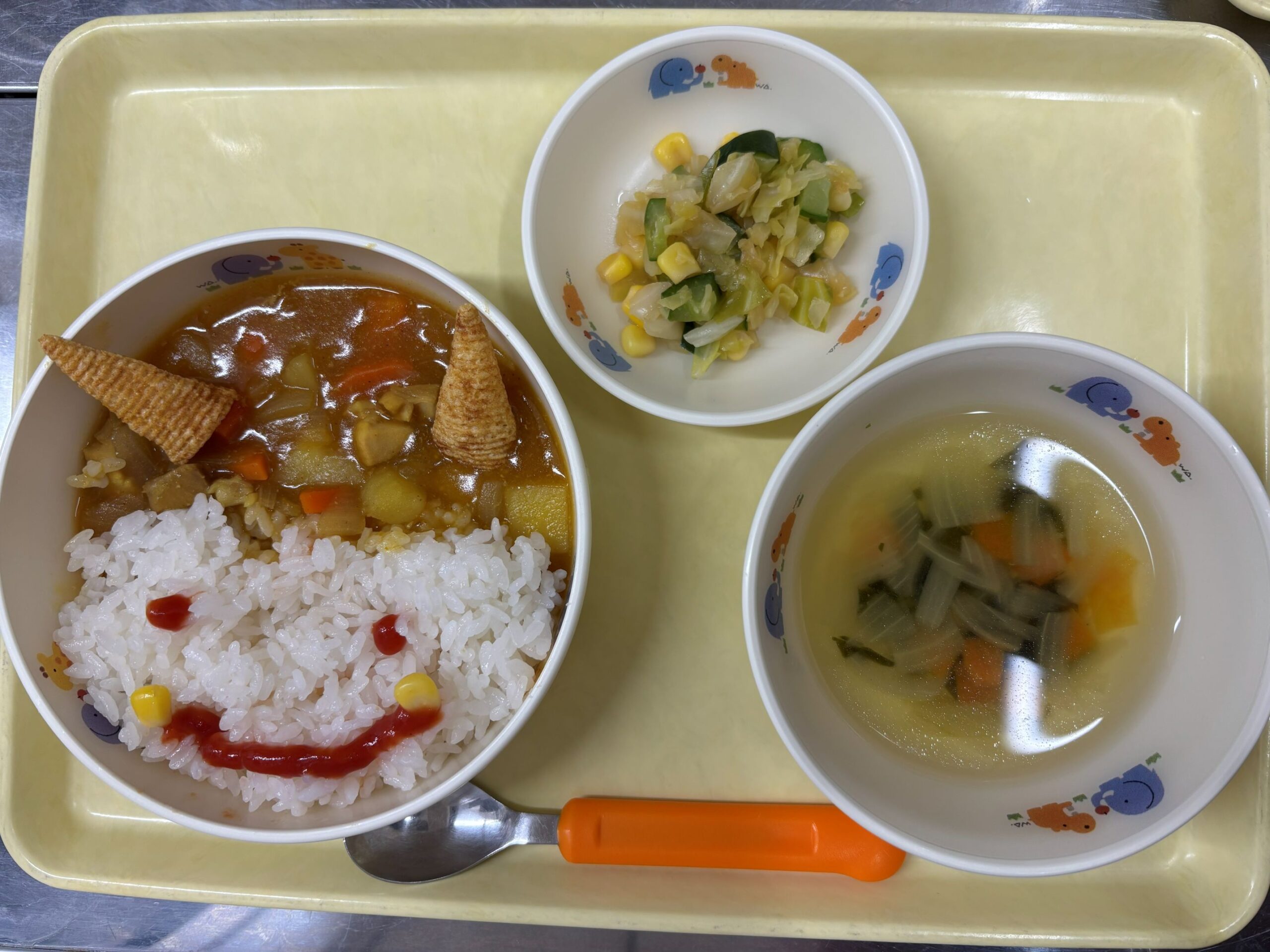 鬼さんカレー キャベツときゅうりとコーンの和えもの 中華スープ