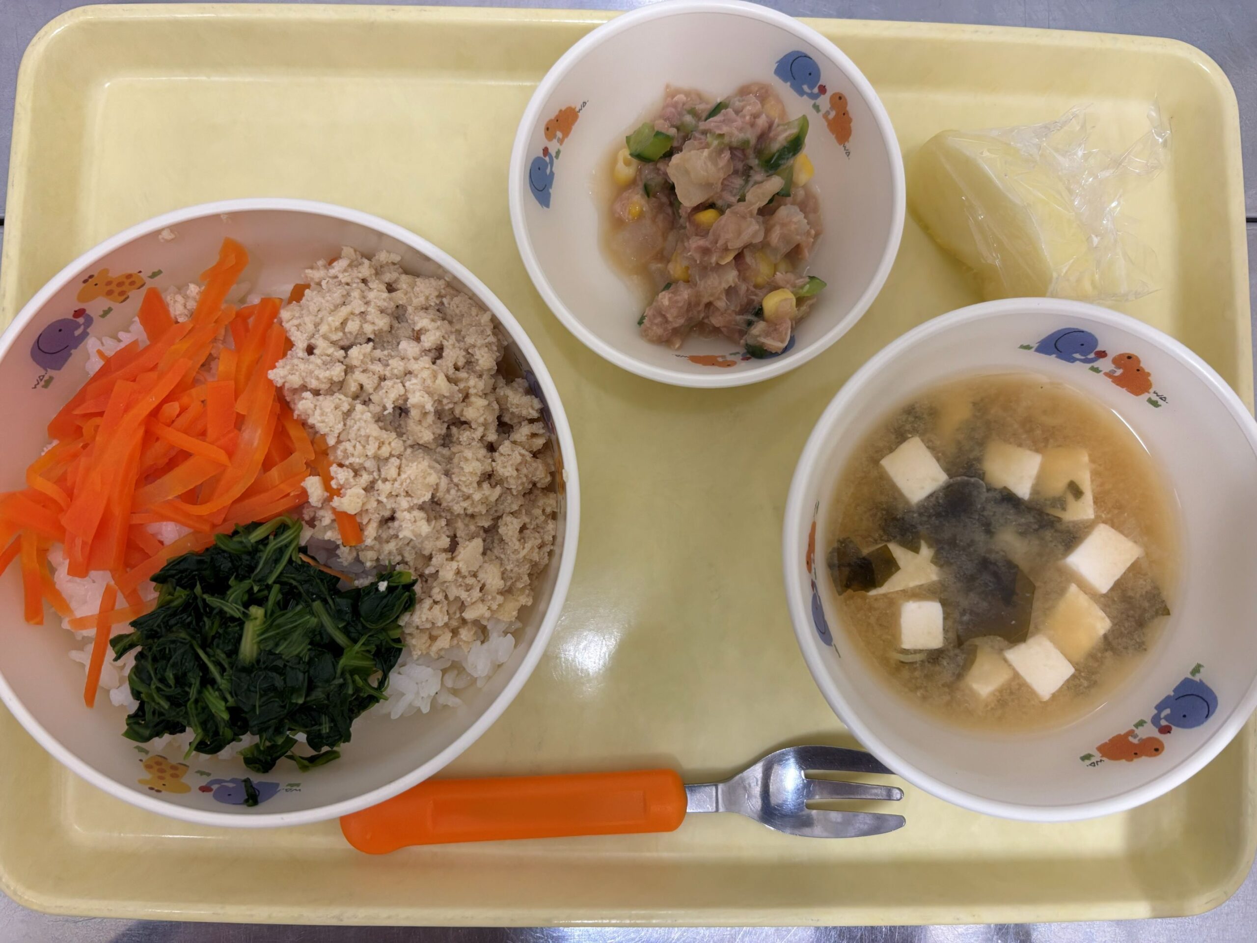 今日は、三色そぼろ丼は、野菜とお肉混ぜてみんなよく食べてました。