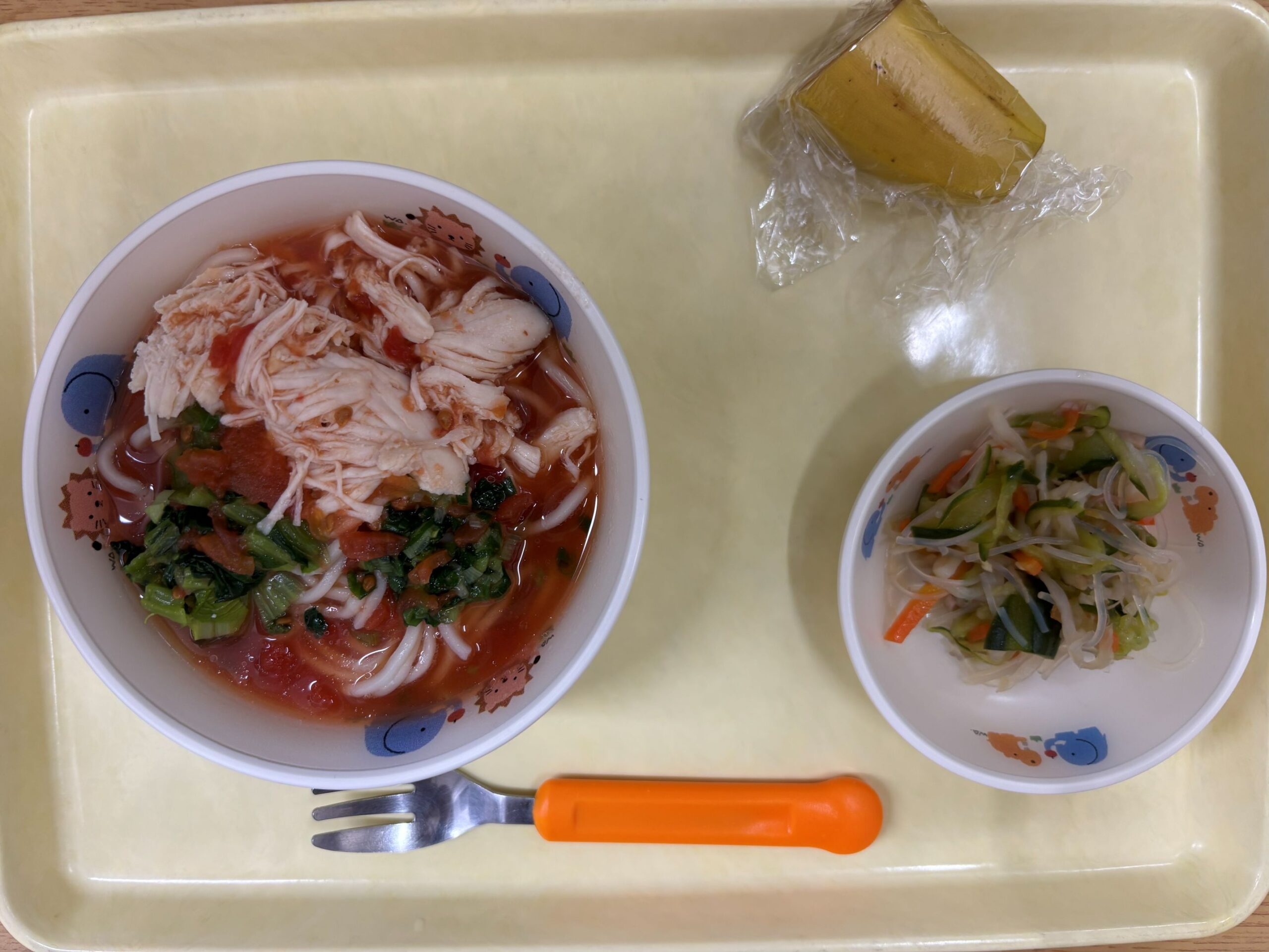 今日は、トマトラーメンでした。トマトが苦手な子がいたので、残食も多かったです。 おやつの鶏そぼろおにぎりは、みんな完食でした。