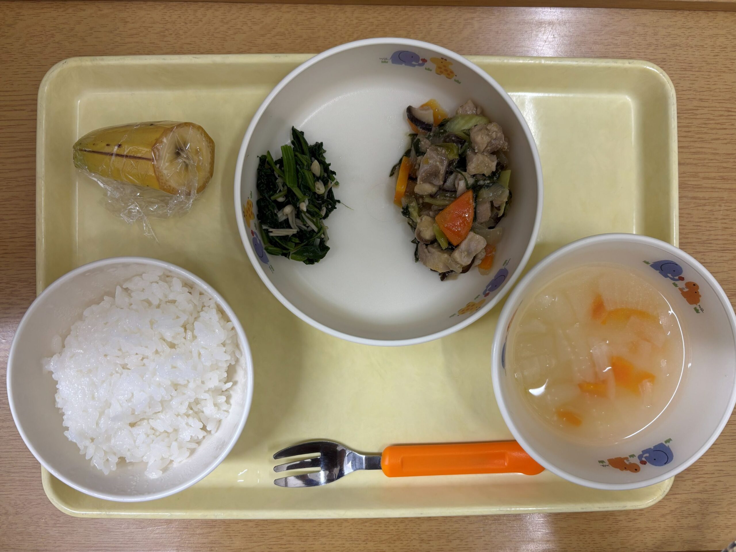 ご飯 鶏肉とチンゲン菜の中華炒め 中華スープ ほうれん草とえのきのお浸し バナナ