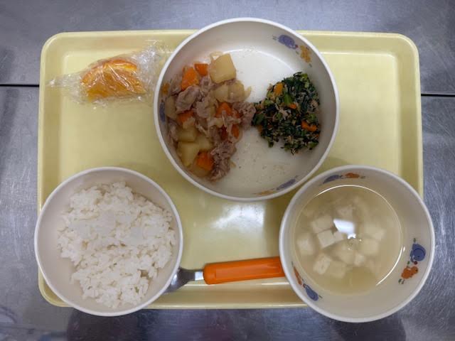 ご飯 肉じゃが 小松菜のごまツナ和え 中華スープ オレンジ